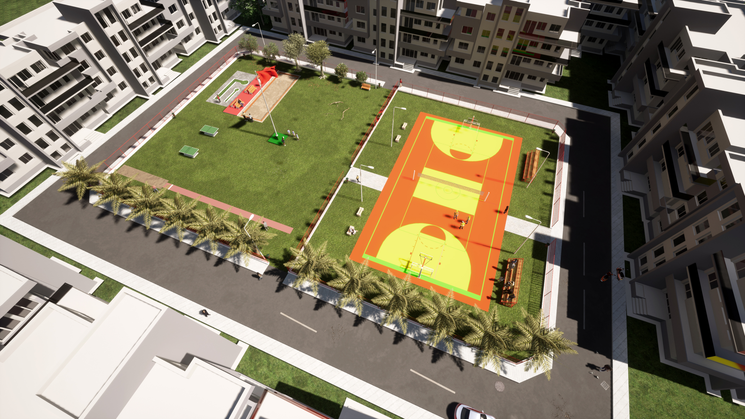 La résidence des Pionniers comporte aussi un terrains de jeux ( Basket, Tennis, Hand-Ball, Football, ngola, echeques, tennis de tables, mini-golf). Les boutiques proposeront des services de proximité. Ils seront proposé à la vente selon un cahier des charges pré-défini.